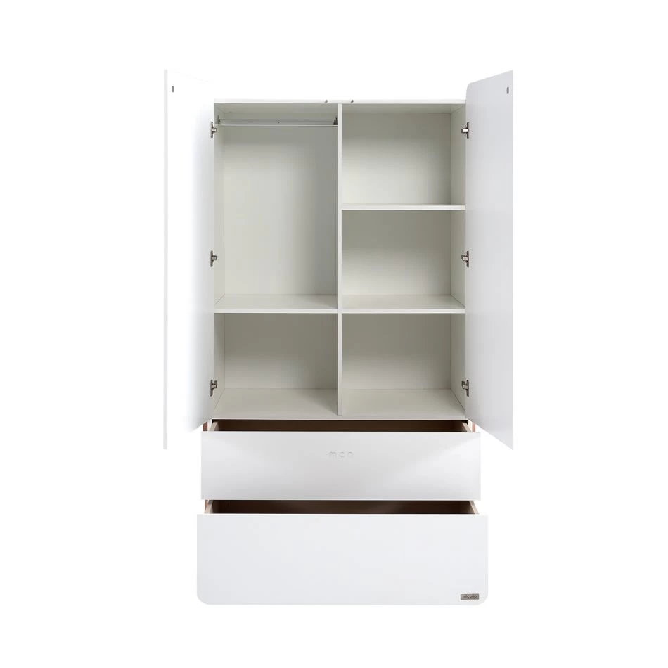 L’armoire Swing est composée de quatre petites étagères et d’une grande étagère avec penderie intégrée.