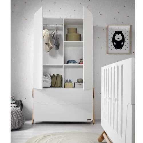 L’armoire 2 portes et 2 tiroirs Swing blanche de la marque Micuna est un meuble élégant et pratique pour ranger les affaires de bébé. Caractéristiques techniques : – 2 portes avec push system (appuyer pour ouvrir).- 3 petites niches + 1 grande niche.- Tringle avec lumière LED intégrée à placer d’un côté ou de l’autre.- 2 tiroirs.- Peinture à l’eau et vernis non toxique.- Fonctionne avec 1 pile AAA LR03 (pour la lumière LED).- Fabrication en Espagne.