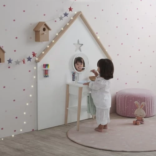 La coiffeuse enfant 2 en 1 Micussori de la marque Micuna apportera une jolie touche de décoration à la chambre de votre enfant. Votre tout-petit pourra se regarder dans le miroir ou faire semblant de se laver les mains comme un grand. Caractéristiques techniques : – Miroir incassable réglable sur 3 hauteurs.- Évier avec couvercle.- Transformable en coiffeuse ou table d’appoint.- Fabrication en Espagne.