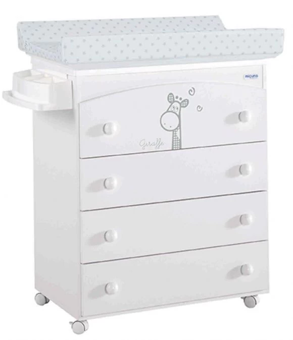 Au niveau de la partie supérieure, elle est dotée d’un pratique plan à langer en plastique avec un élégant revêtement à étoiles grises ou à ours avec des cœurs de couleur beige.