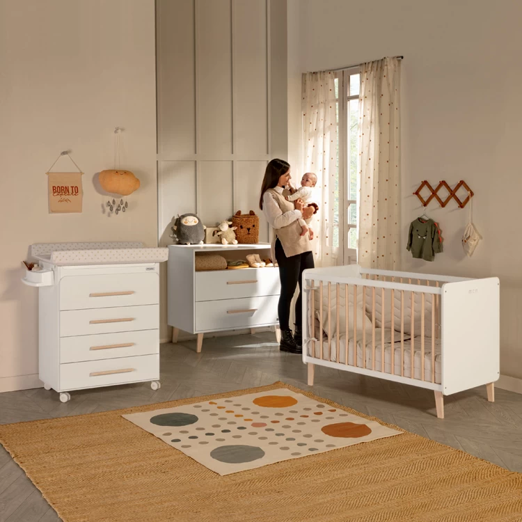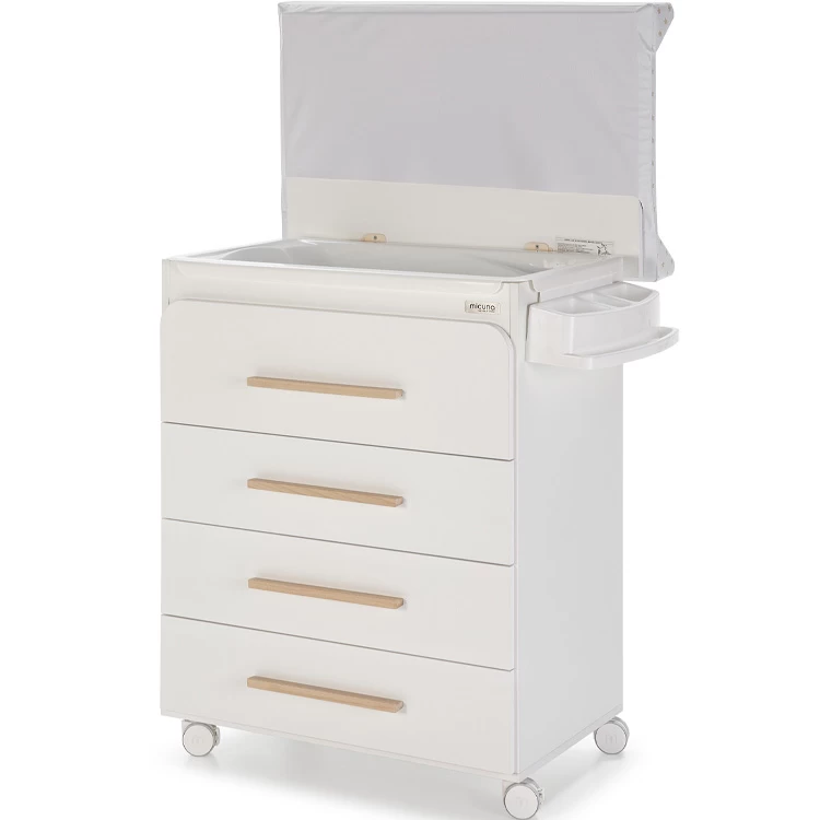 Caractéristiques techniques : – Commode à langer avec baignoire intégrée.- Matelas à langer intégré avec housse plastifiée.- Baignoire intégrée sous le matelas avec tuyau d’évacuation de l’eau et présentoir pour poser le savon.- 4 tiroirs.- 4 roues incluses.- Protection antibactérienne et antimicrobienne.- Fabrication en Espagne.Age conseillé :