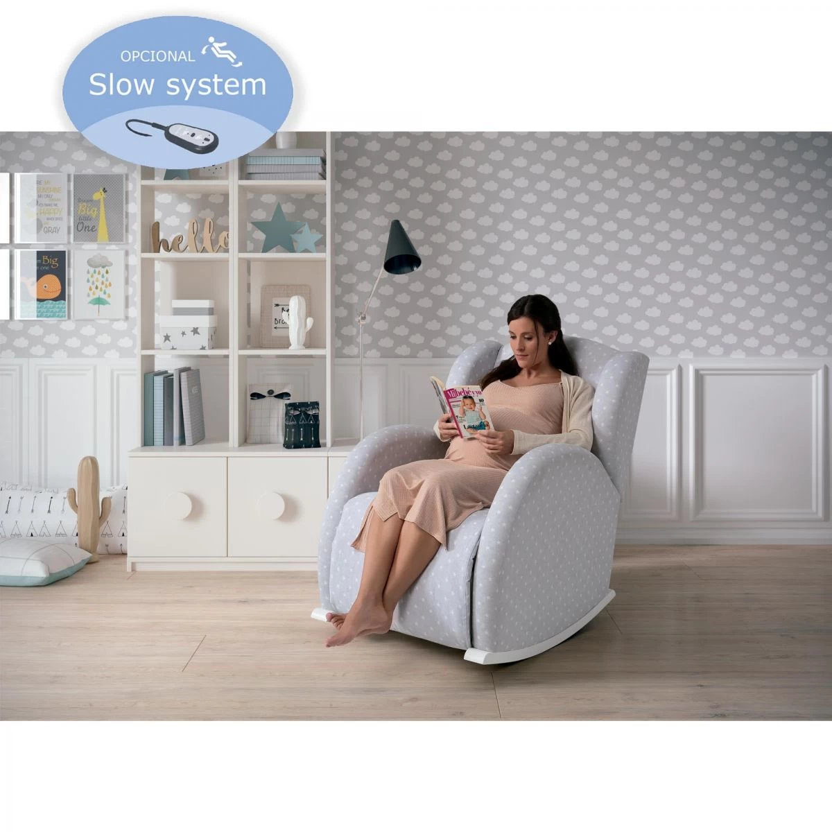 La grossesse et les premiers mois de la vie de votre bébé sont une étape unique, dans laquelle il est très important de prendre soin de soi et de se reposer. Le système Slow, vous permet de pouvoir vous reposer dans trois positions confortables. La chaise à bascule peut être inclinée automatiquement grâce à la télécommande. Avec le système Docking vous pouvez venir aimanter un ou deux berceau Micuna de façon à pouvoir vous basculer en simultané.